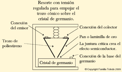 El prototipo del transistor de punto de contacto estaba montado en un soporte de ángulo recto, con un trozo de poliestireno de corte triangular, que tenía pegadas dos tiras de laminilla de oro, cuidadosamente cortadas con una navaja para rasurar, un resorte sujetado presionaba el lado del corte inferior de las dos laminillas que se posaba en la superficie irregular del germanio, dos alambres de cobre estaban conectados a las laminillas y otro a la base con el germanio, las dos tiras de laminillas fueron nombradas respectivamente "Colector" y "Emisor", la parte inferior donde estaba depositado el germanio se llamó "Base". Los alambres del transistor se conectaron a dos baterías que polarizaban el transistor con el voltaje apropiado, mientras la bobina de un transformador inducía la señal de prueba desde un oscilador de audio, otro transformador en la salida del circuito fue utilizado para ver la amplificación por medio de un osciloscopio. El circuito constaba de un transistor, dos transformadores, un generador de audio, dos baterías, un osciloscopio y un interruptor rotatorio, fueron los componentes para comprobar el funcionamiento del transistor en condiciones de trabajo, una vez detectada la amplitud de la señal de entrada de la función amplificadora, se descubrió por primera vez el efecto transistor de respuesta instantánea, sin el calentamiento de los filamentos de los bulbos, ni el alto voltaje que utilizaban, además la duración de vida del transistor es superior a la del tubo de vacío.
