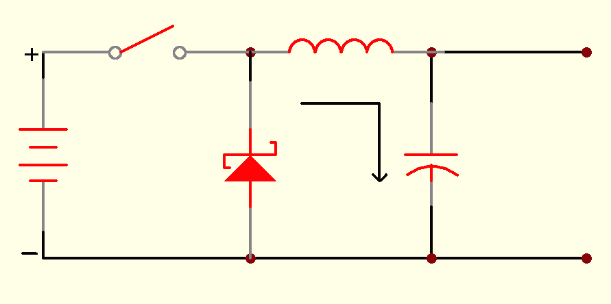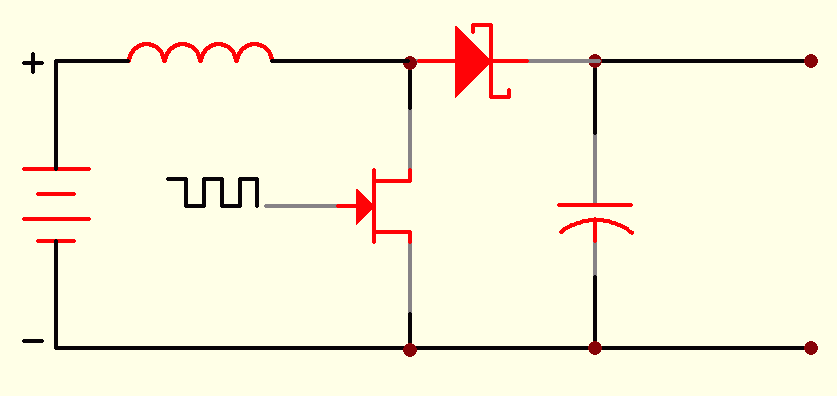 Un switch cerrado indica la expansión del campo magnético del inductor cuando el diodo no conduce y descarga el condensador, mientras que un switch abierto indica la descarga del campo magnético del inductor cuando el diodo conduce para cargar el condensador. Esto se produce de una forma repetitiva por medio de un oscilador para las dos fases de conexión y desconexión.