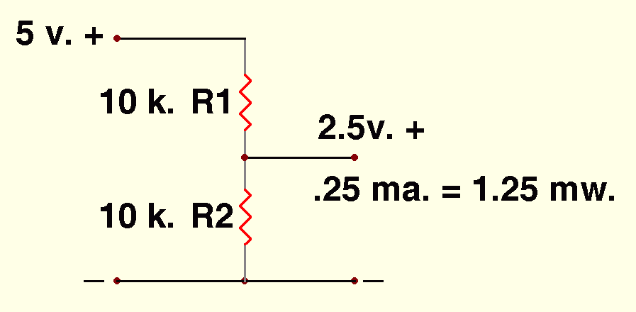 I = V. ent / (R1+R2) Ej: .25ma = 5V / (10 kohm + 10 kohm)